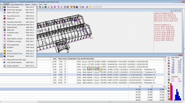 ODEON是建筑声学模拟软件,软件的基础是几何声学,采用虚声源法与声线跟踪法相结合的混合法以及第二声源发进行计算机声场模拟,具备可视化功能,该软件广泛运用于设计研究和工程领域,能够对房间声学、厅堂声学、噪声控制进行模拟计算。 利用ODEON进行室内声学模拟,即对3D模型中声源到接收点的房间脉冲就行预测,这些模拟可以从SketchUp或其他CAD软件中导入。软件可以导出T30,T20,EDT,SPL等声学参数。通过控制室内反射、声吸收和界面散射性质,可使音乐、语音及扬声器系统达到想要的声学或降噪效果。